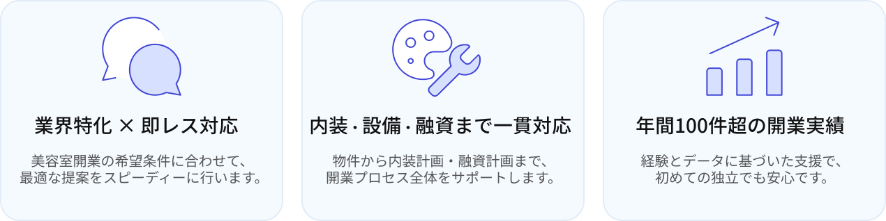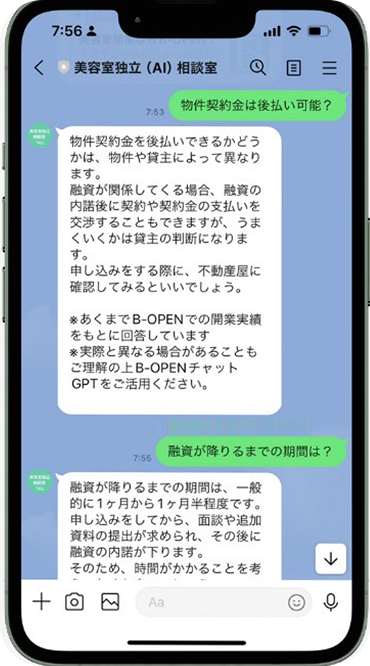 理美容室の開業準備・物件探し・融資・内装など、開業に関するあらゆるお悩みに24時間365日お答えできるAI相談窓口です。