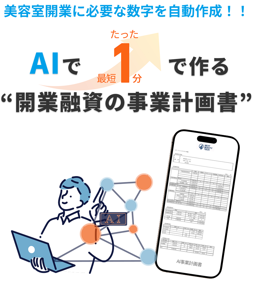 AI事業計画書は、美容室開業に必要な項目を入力していくだけで、融資に通りやすい形の事業計画書を自動作成できるWEBアプリです。