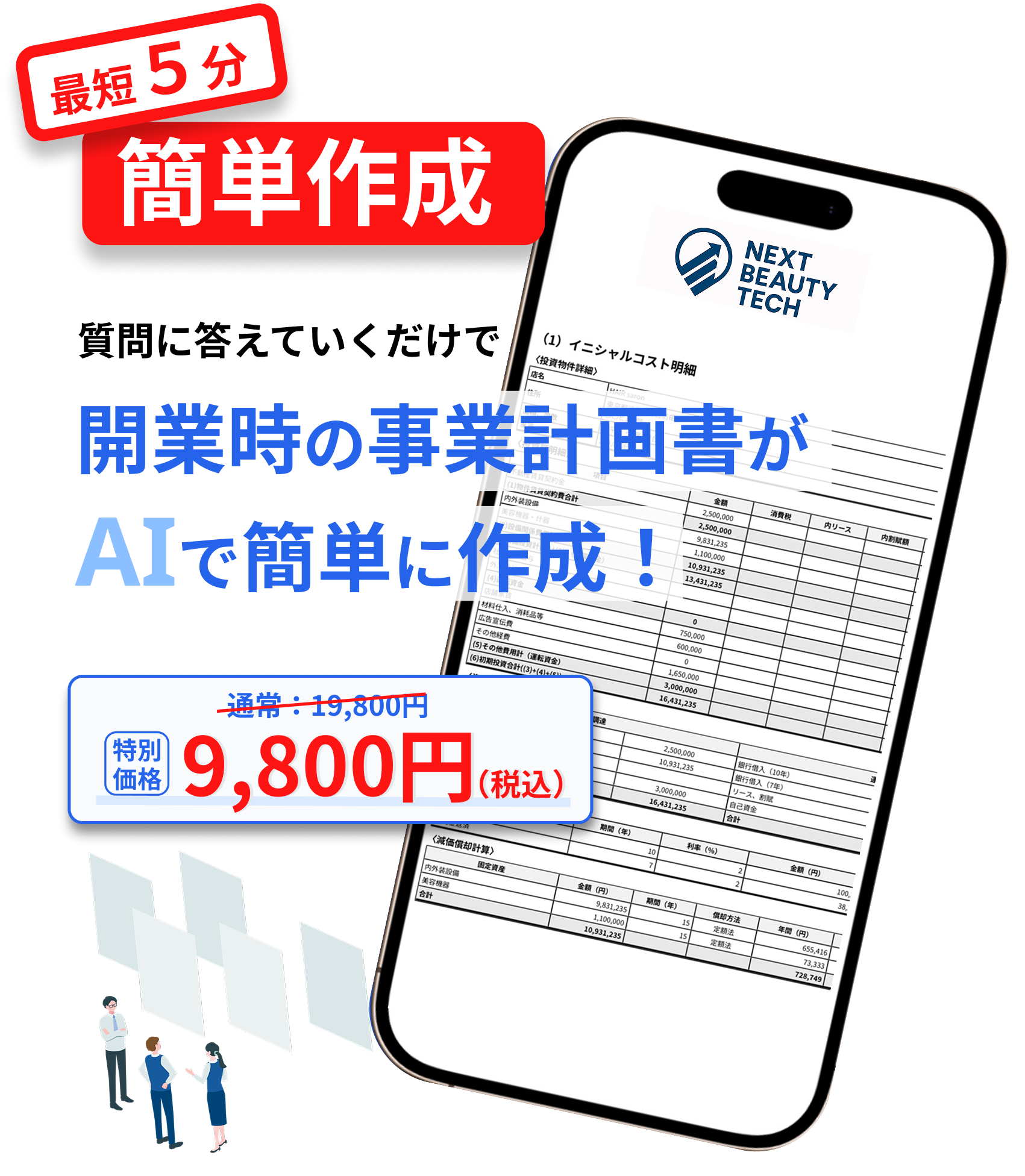 A. AIによる事業計画書の自動作成・内容の調整・最大3回までの修正対応まで含まれています。すべて込みで9,800円(税込)です。